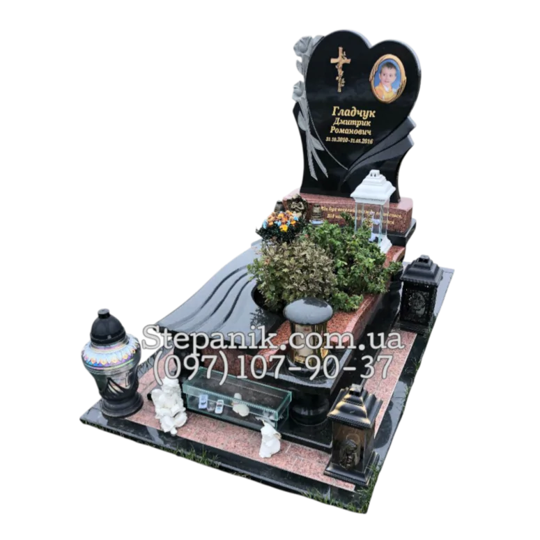 Дитячий пам’ятник сердечко червоний з чорним, з вирізаними елементами та квітником