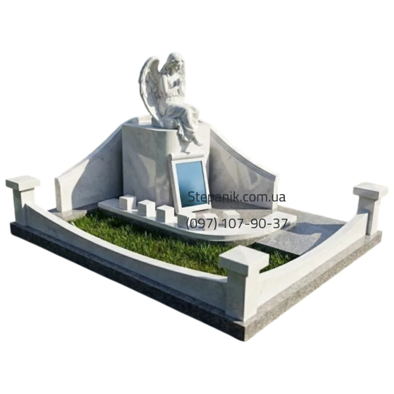 Дитячий пам’ятник з мармору квадратної форми з декоративними елементами та загородкою