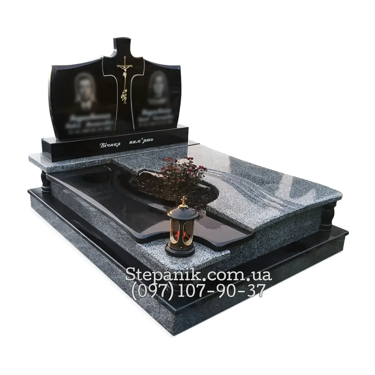 Це солідний подвійний пам’ятник, який виглядає дуже по-сучасному за рахунок поєднання чорного та сірого каменю. Посередині головної плити викарбуваний хрест, а по боках достатньо місця для двох портретів. Сама могила накрита не просто суцільною плитою, а зроблена «сходинками» з гарними вирізами та квітником по середині