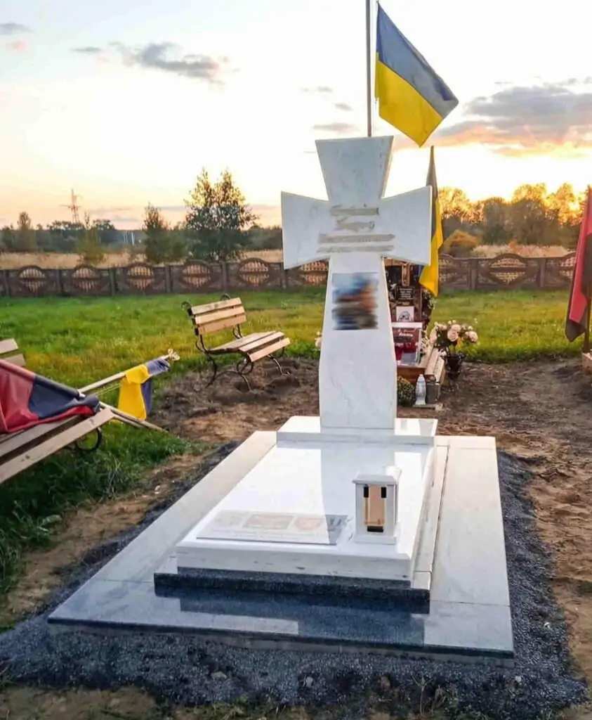 - Розташування: Зазвичай шеврон розміщують біля портрета або на зворотній стороні стели, де описаний бойовий шлях воїна.
